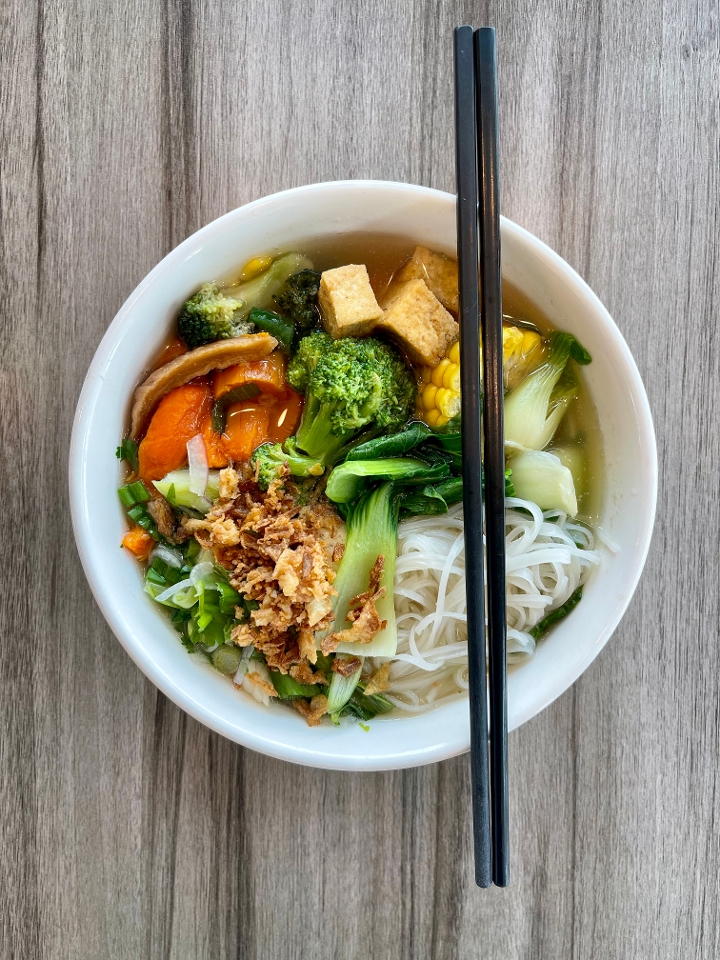 Bánh phở rice noodles · slow-simmered vegetable broth · tofu · mushrooms · bok choy · daikon · carrots · broccoli · white onion · green onion · cilantro · fried onion served with bean sprouts · thai basil · jalapeño · lime on the side