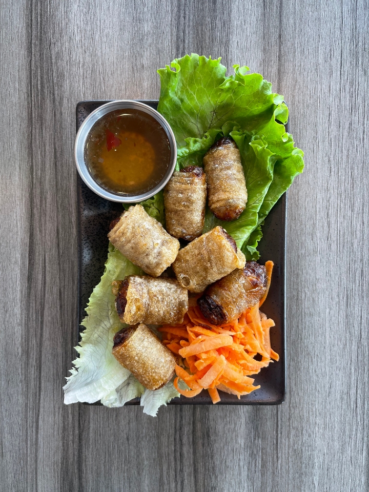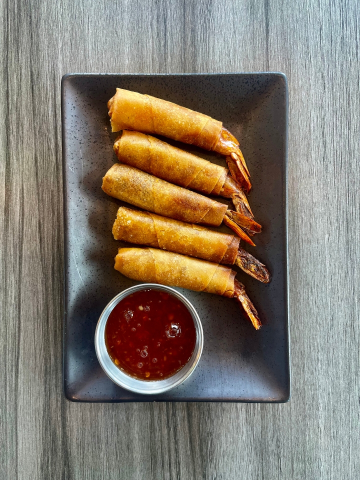 Golden-fried shrimp egg rolls. Served with sweet chili sauce.