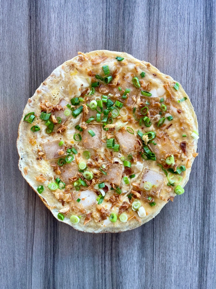 Pan-fried rice cakes with egg, scallions, and daikon, lightly crisped and served with soy sauce.