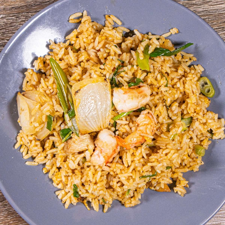 Wok-fried rice with seasoned egg, shrimp, white onion, green onion, and cilantro.