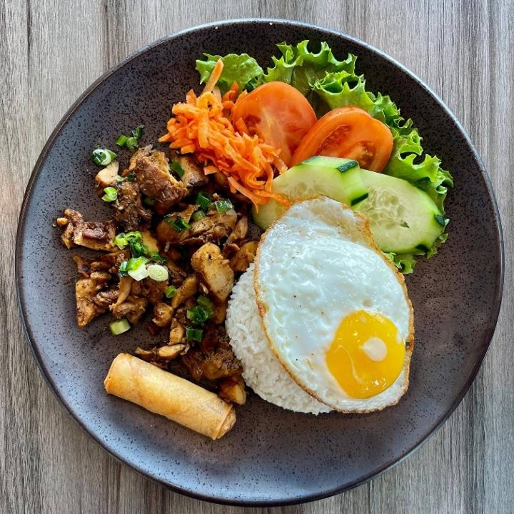 Char-grilled pork served over steamed white rice with a fried egg, lettuce, tomato, cucumber, carrots, and a crispy egg roll..