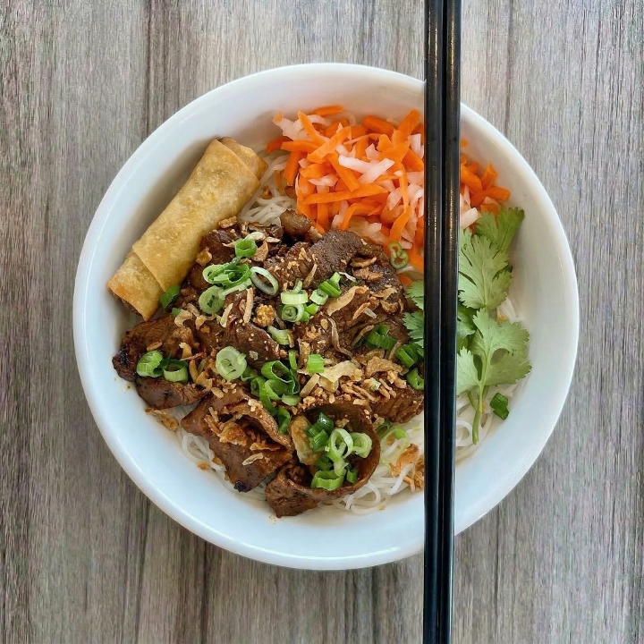 Grilled marinated beef served over vermicelli noodles with crisp lettuce, cucumber, bean sprouts, pickled carrots, and cilantro. served with house fish sauce and a crispy egg roll.