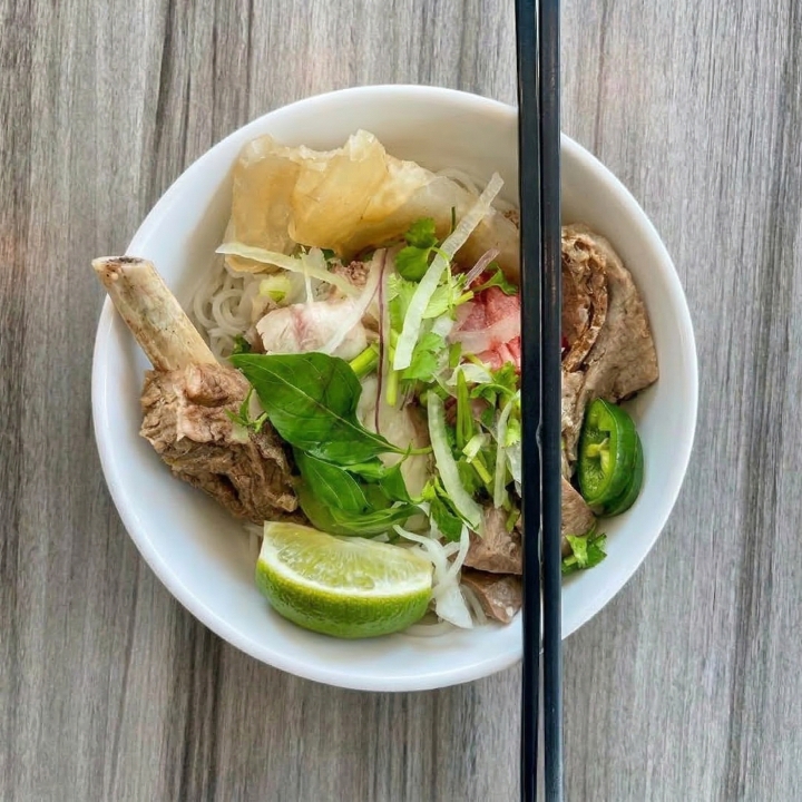 Bánh phở rice noodles · 24-hour slow-simmered beef bone broth · your choice of up to four beef cuts · white onion · green onion · cilantro served with bean sprouts · thai basil · jalapeño · lime on the side