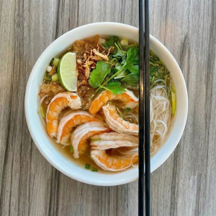 Bánh phở rice noodles · slow-simmered chicken bone broth · tender shrimp · white onion · green onion · cilantro served with bean sprouts · thai basil · jalapeño · lime on the side