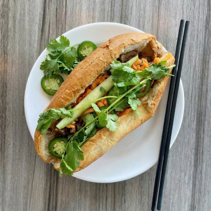 Grilled marinated chicken in a toasted Vietnamese baguette with pickled carrots, cucumber, jalapeño, cilantro, and house mayo.