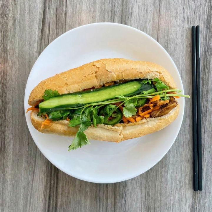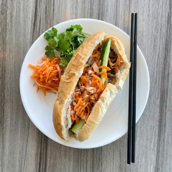Char-grilled pork layered inside a toasted Vietnamese baguette with pickled carrots, cucumber, jalapeño, cilantro, and house mayo.
