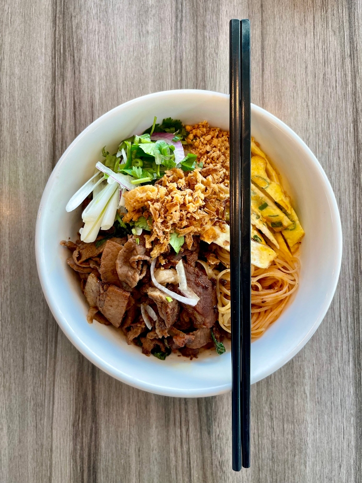 Char-grilled pork layered over vermicelli noodles with lettuce, cucumber, bean sprouts, pickled carrots, and cilantro. served with house fish sauce and a crispy egg roll.