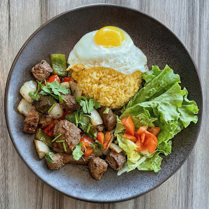 Wok-seared 5 oz filet mignon with white onion and bell pepper. served with fried rice, fried egg, house salad, and lime salt & pepper (chanh muối).