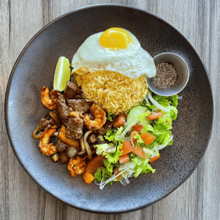 Wok-seared 5 oz filet mignon and shrimp with white onion and bell pepper. served with fried rice, fried egg, house salad, and lime salt & pepper.